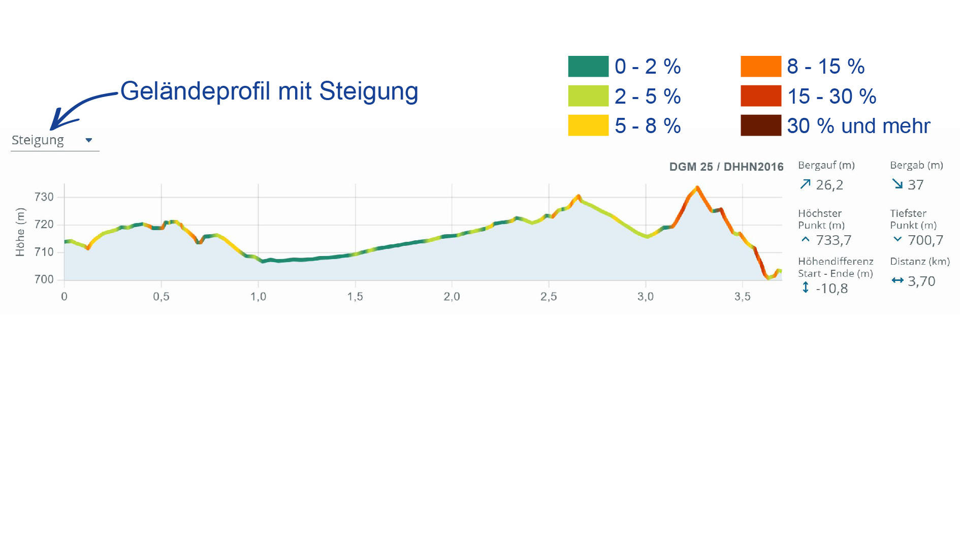 Das Geländeprofil stellt die Höhen in Metern oder die Steigung in % übersichtlich dar.